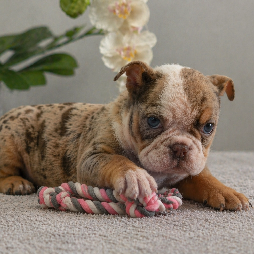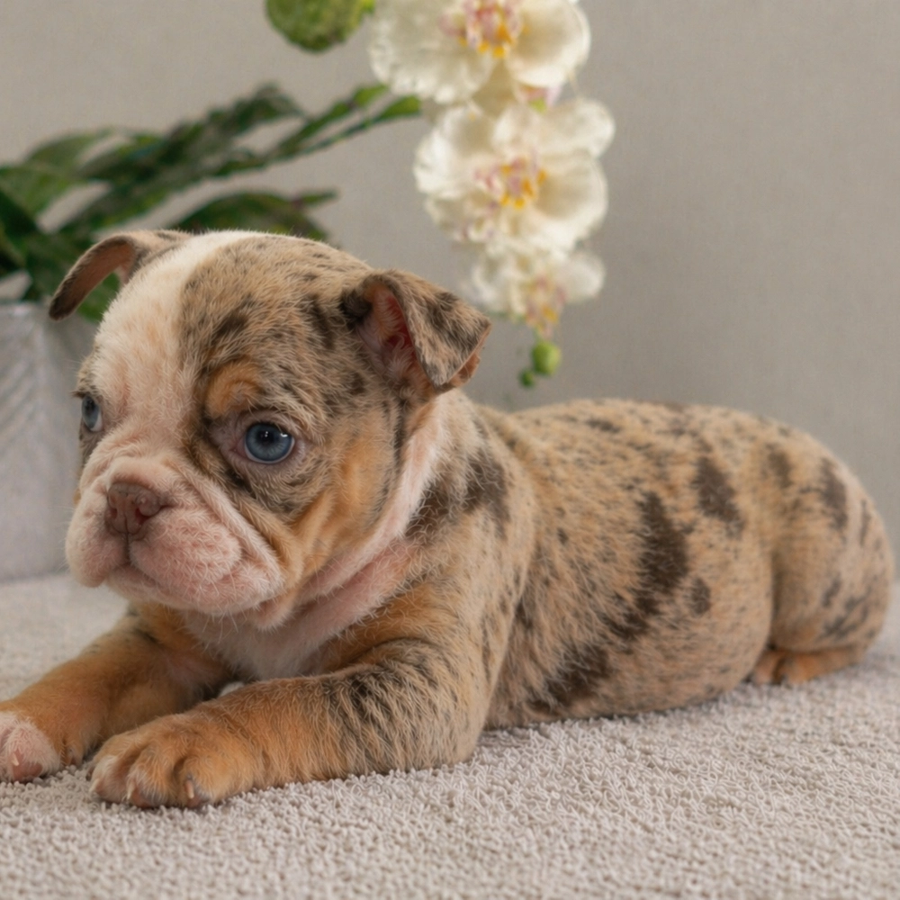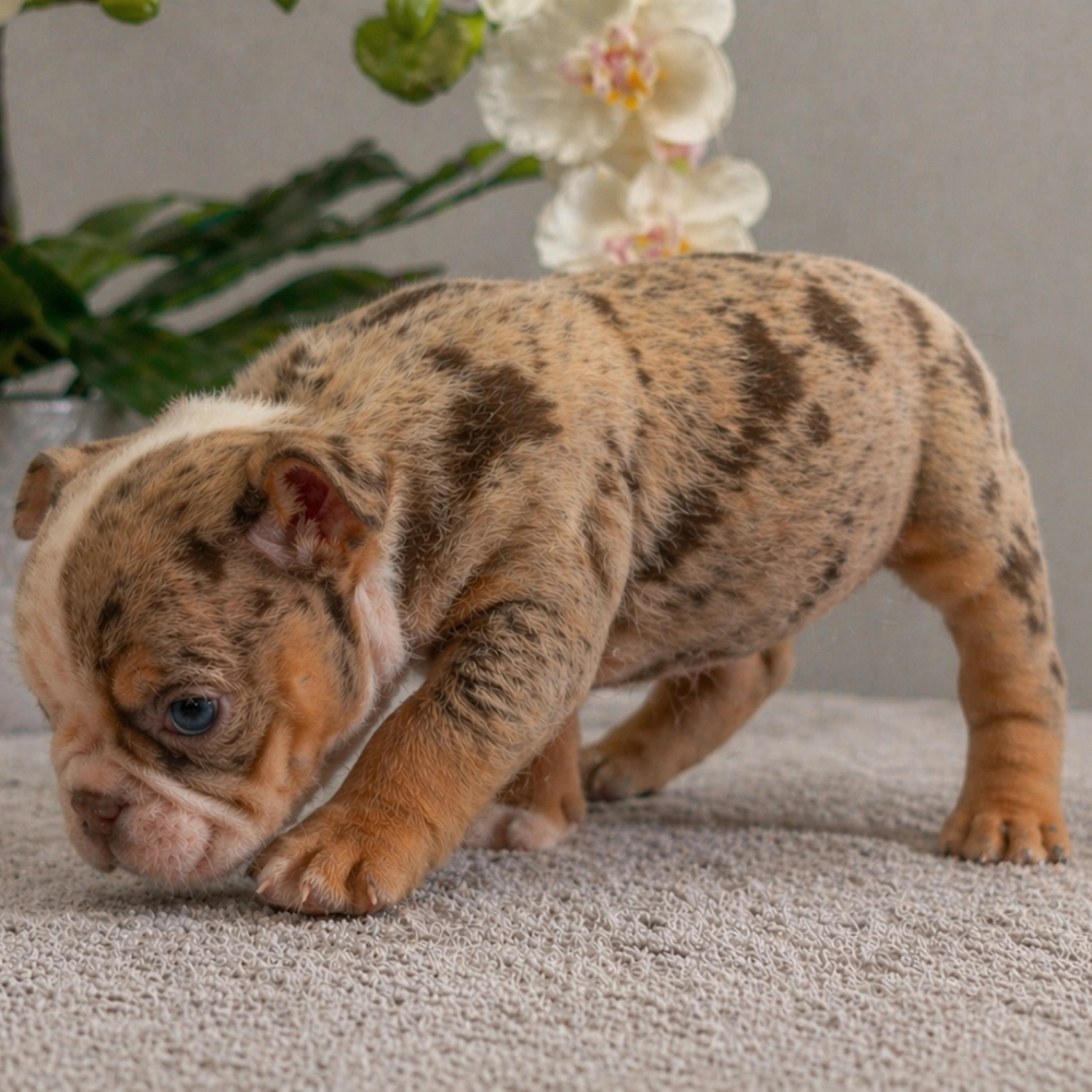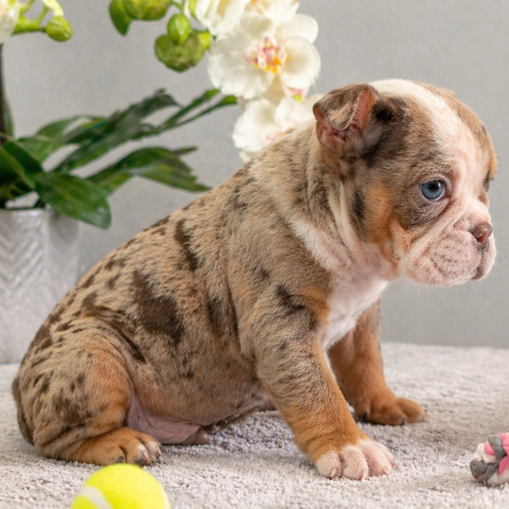 Charming English Bulldog Sophie awaits you, boasting a delightful chocolate merle coat. With Sophie's relaxed demeanor, she's an ideal cuddle buddy, always ready to offer warmth and affection. As an Aquarius, Sophie is naturally friendly and slightly quirky, adding charm to her sweet personality. Central Park Puppies will safely deliver the puppy directly to your home, anywhere in the US. Ready to bring Sophie into your loving home? She's prepared to join your family and bring happiness.