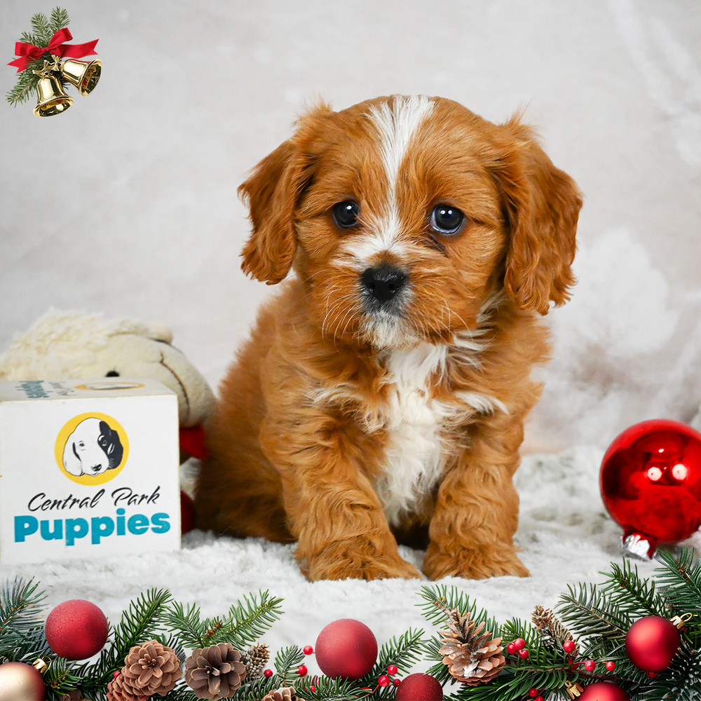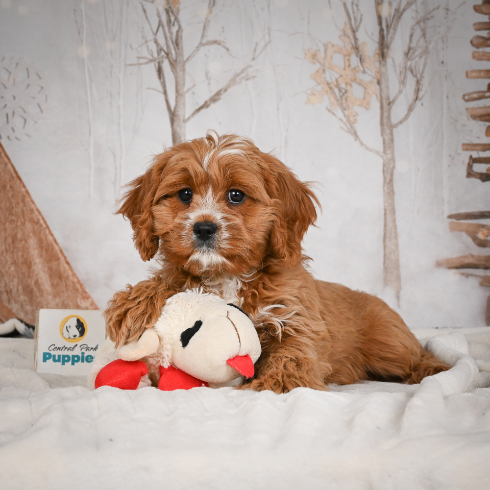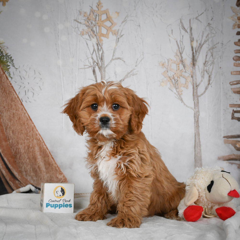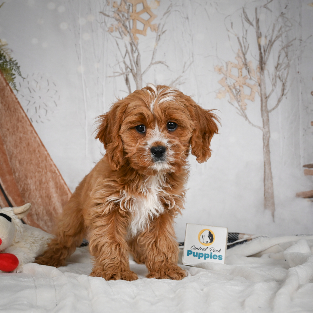 Adorable F1 Cavapoo puppy named Topaz. Topaz brings energy and love into any home. Always ready to play, his friendly nature is irresistible. As a Scorpio, Topaz is naturally intuitive and fiercely loyal, promising a strong bond with his new family. Central Park Puppies will safely deliver Topaz directly to your home, anywhere in the US. Ready to make Topaz a cherished member of your family? Embrace his joyful presence and playful nature today!