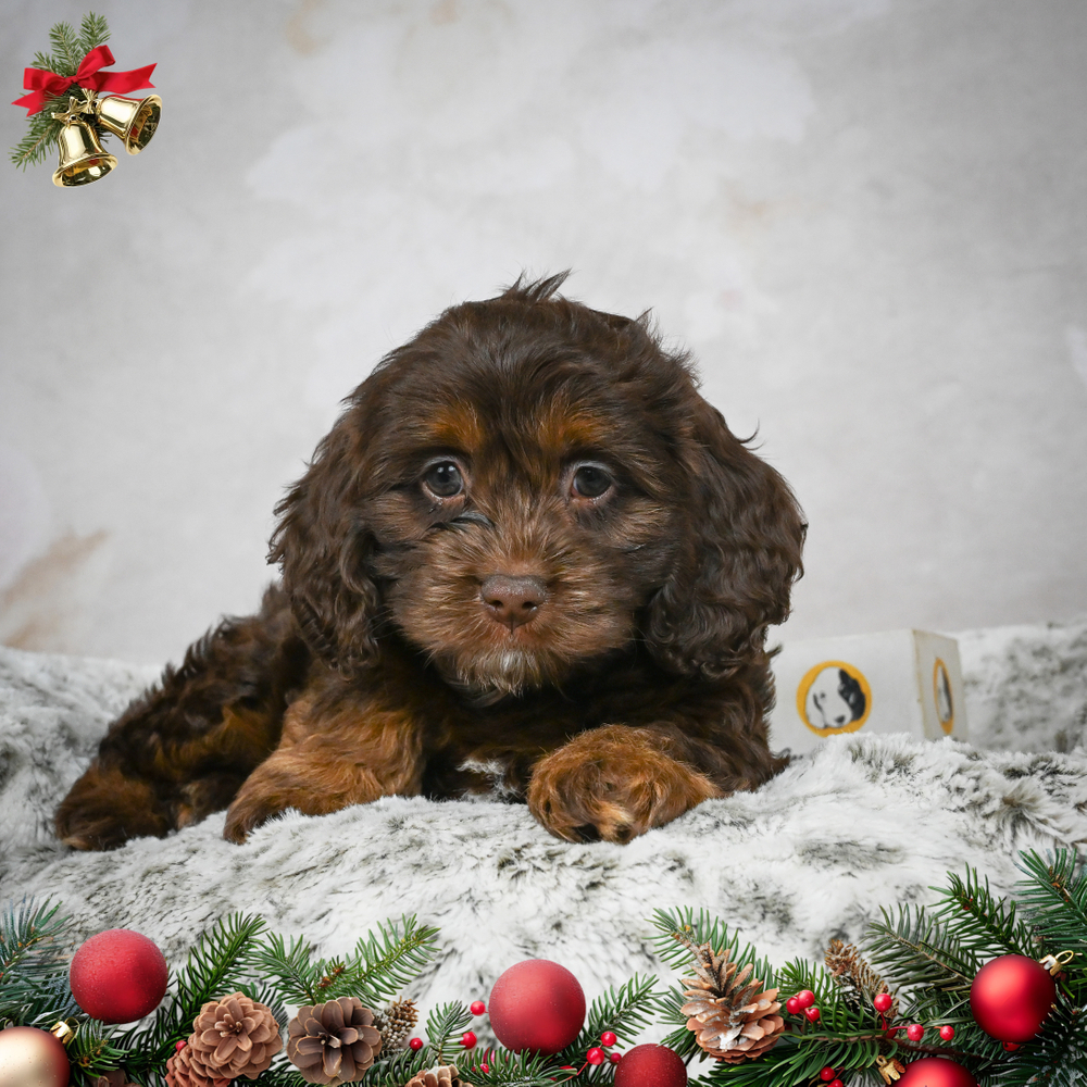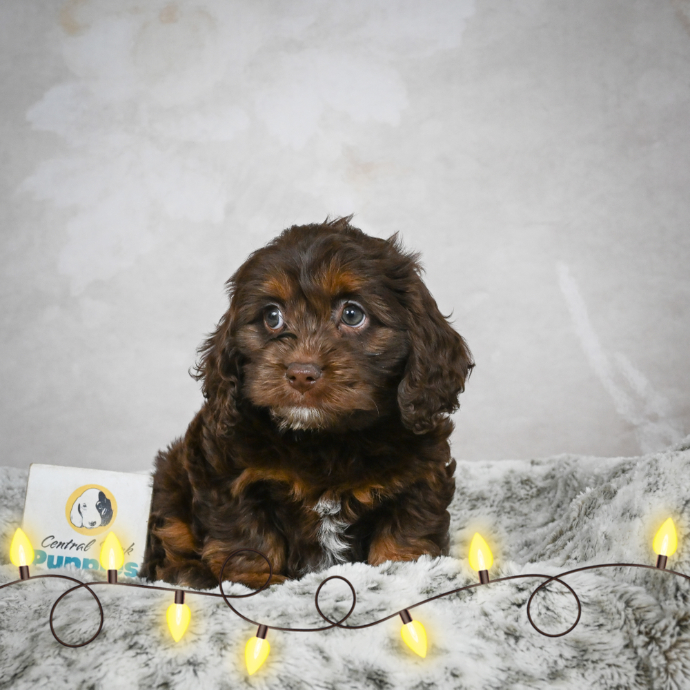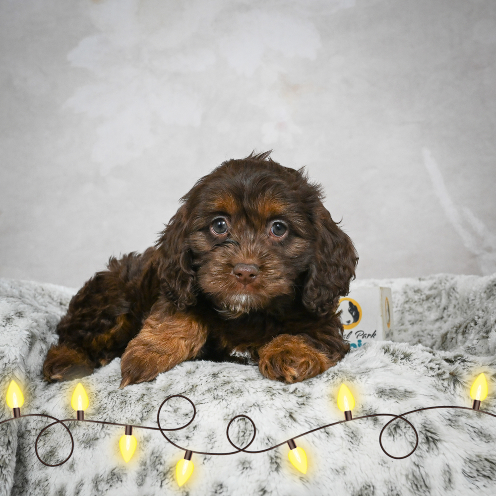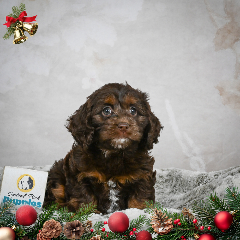 Delightful F1 Cockapoo puppy named Tandy, ready to snuggle into your family. With her soft chocolate and tan fur, Tandy adores playtime and showering her loved ones with cuddles. Scorpios like Tandy are known for their loyalty and determination, making them wonderful companions. Central Park Puppies will safely deliver the puppy directly to your home, anywhere in the US. Ready to bring Tandy into your loving home? This charming Cockapoo awaits your loving arms and heart!