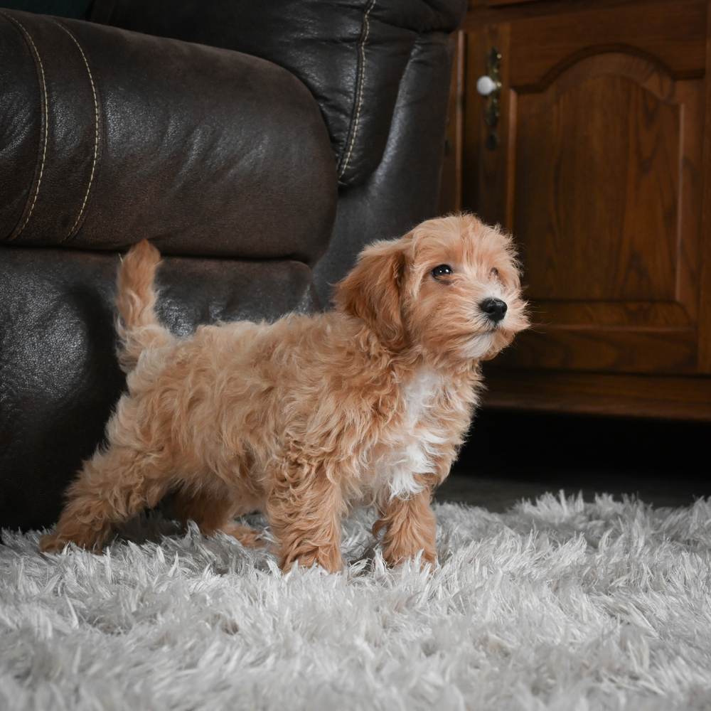 F1 Maltipoo Tofu brings charming joy with his tan and white markings. Tofu is a playful bundle with an endearing tan coat and bright white chest, always ready for affection and fun. As a Libra, Tofu brings balance and harmony to any environment with his friendly nature. Central Park Puppies will safely deliver Tofu directly to your home, anywhere in the US. Ready to bring Tofu into your loving home? He can't wait to be your new best friend.