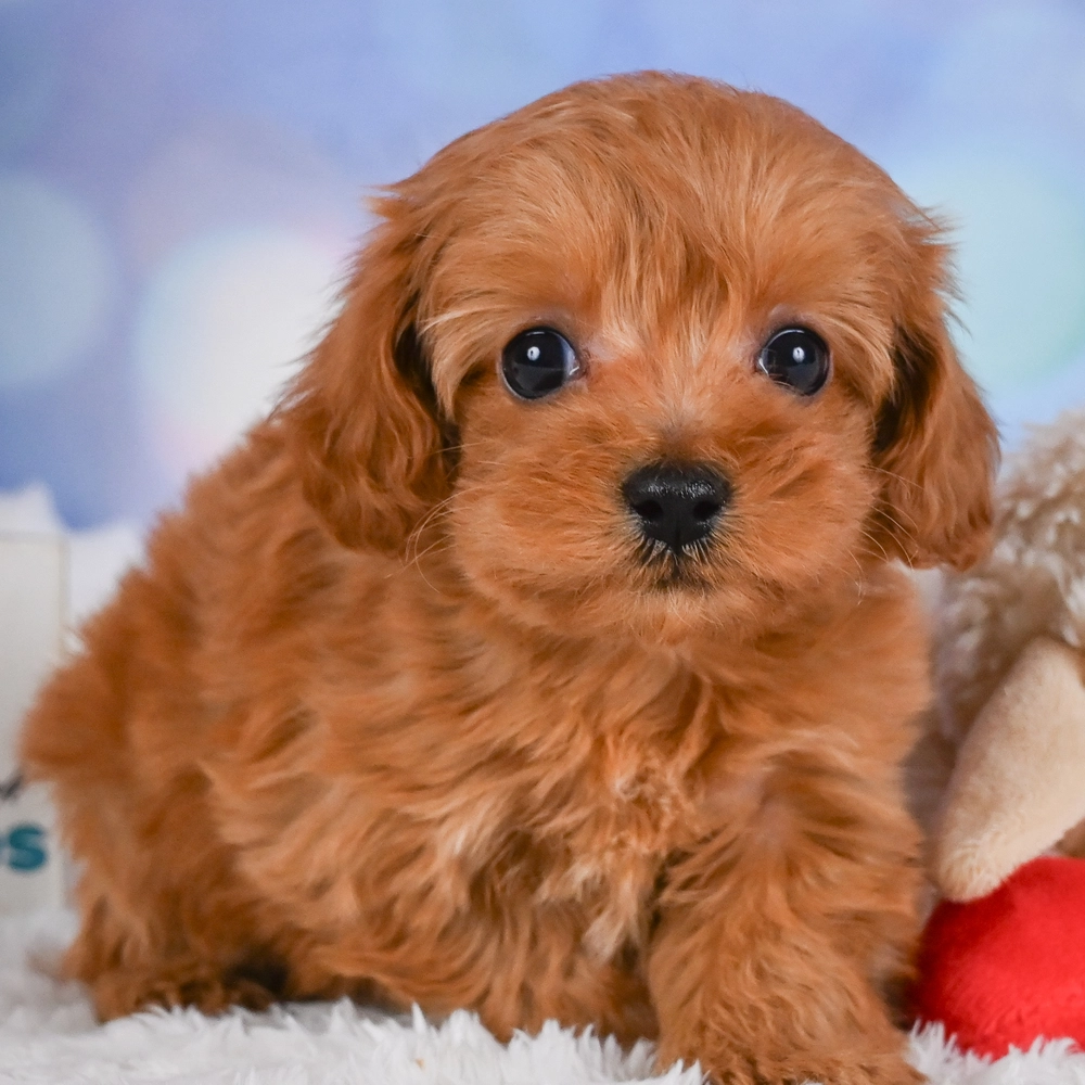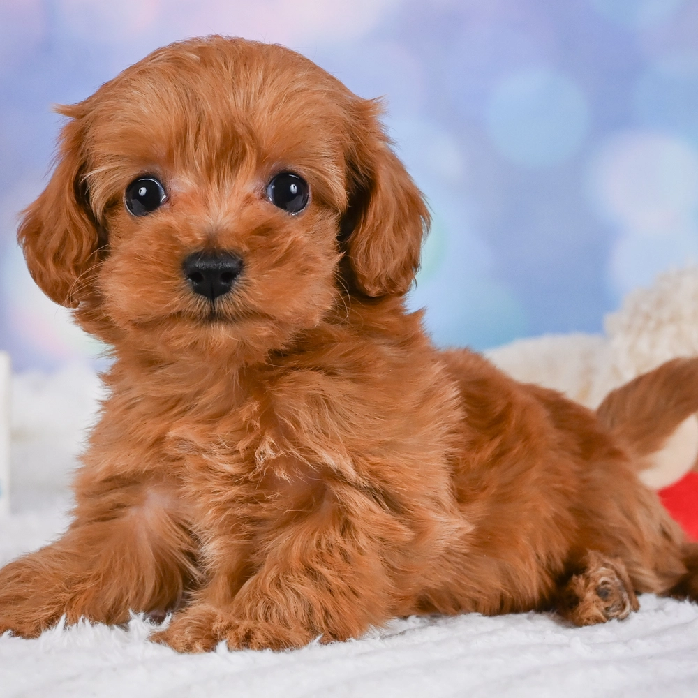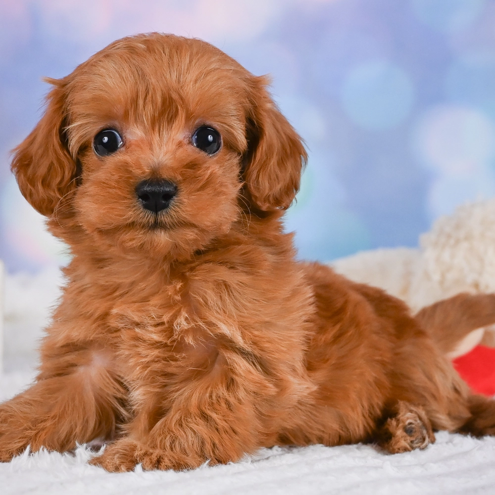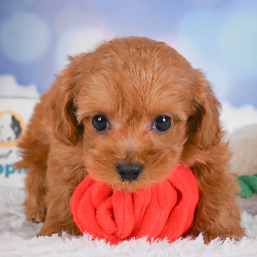 This adorable red charm is an F1B Cavapoo. Flare bursts with playful and affectionate energy, suited for enthusiastic homes. Her cuddly nature makes every day a joy. As a Pisces, Flare is naturally intuitive and compassionate, making her a truly caring companion. Central Park Puppies will safely deliver Flare directly to your home, anywhere in the US. Ready to welcome Flare into your loving home? She’s all set to bring joy into your life!