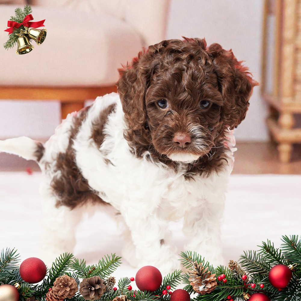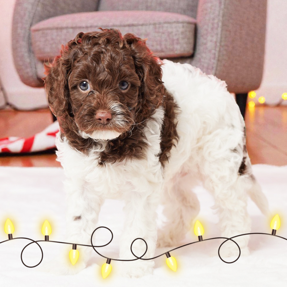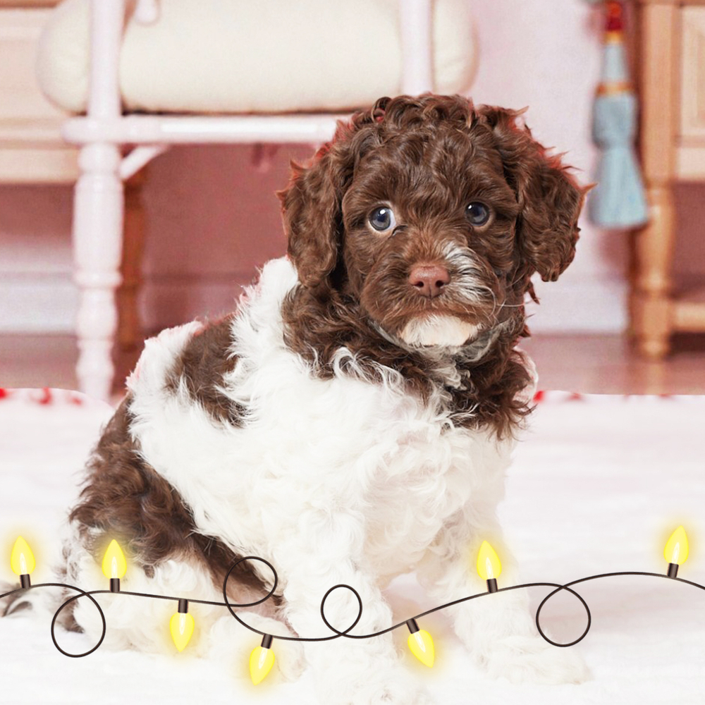 This F1B Cavapoo puppy shines with his chocolate and white coat, ready to enchant any home. Full of charm and sweetness, Ronnie is eager to be your best friend and constant companion. As a Libra, Ronnie thrives in creating harmony and nurturing a peaceful home environment. Central Park Puppies delivers to your doorstep anywhere in the US for your convenience. Ready to bring Ronnie into your loving home? Don't miss your chance to welcome this sweet pup!
