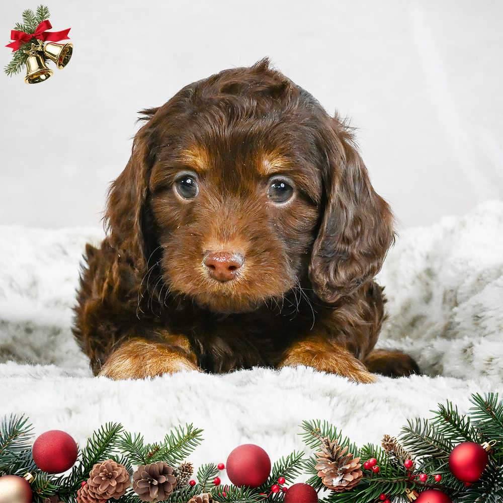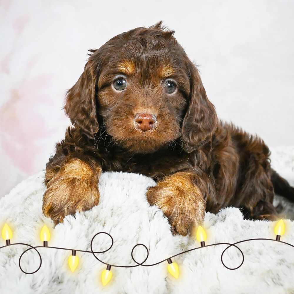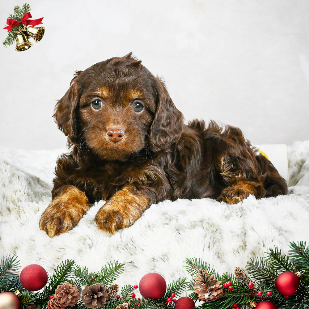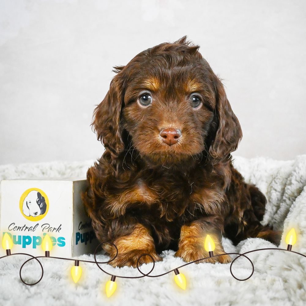 Charming, chocolate F1B Cockapoo, Carob is a delightfully sweet companion you'll adore. Carob sees the world as his playground, his lively jumps and chocolate fluff drawing smiles wherever he goes. Scorpio charm means Carob is both deeply loving and always eager to explore with you. Central Park Puppies will safely deliver Carob directly to your home, anywhere in the US. Ready to bring Carob into your loving home? He awaits someone special like you to cherish forever.