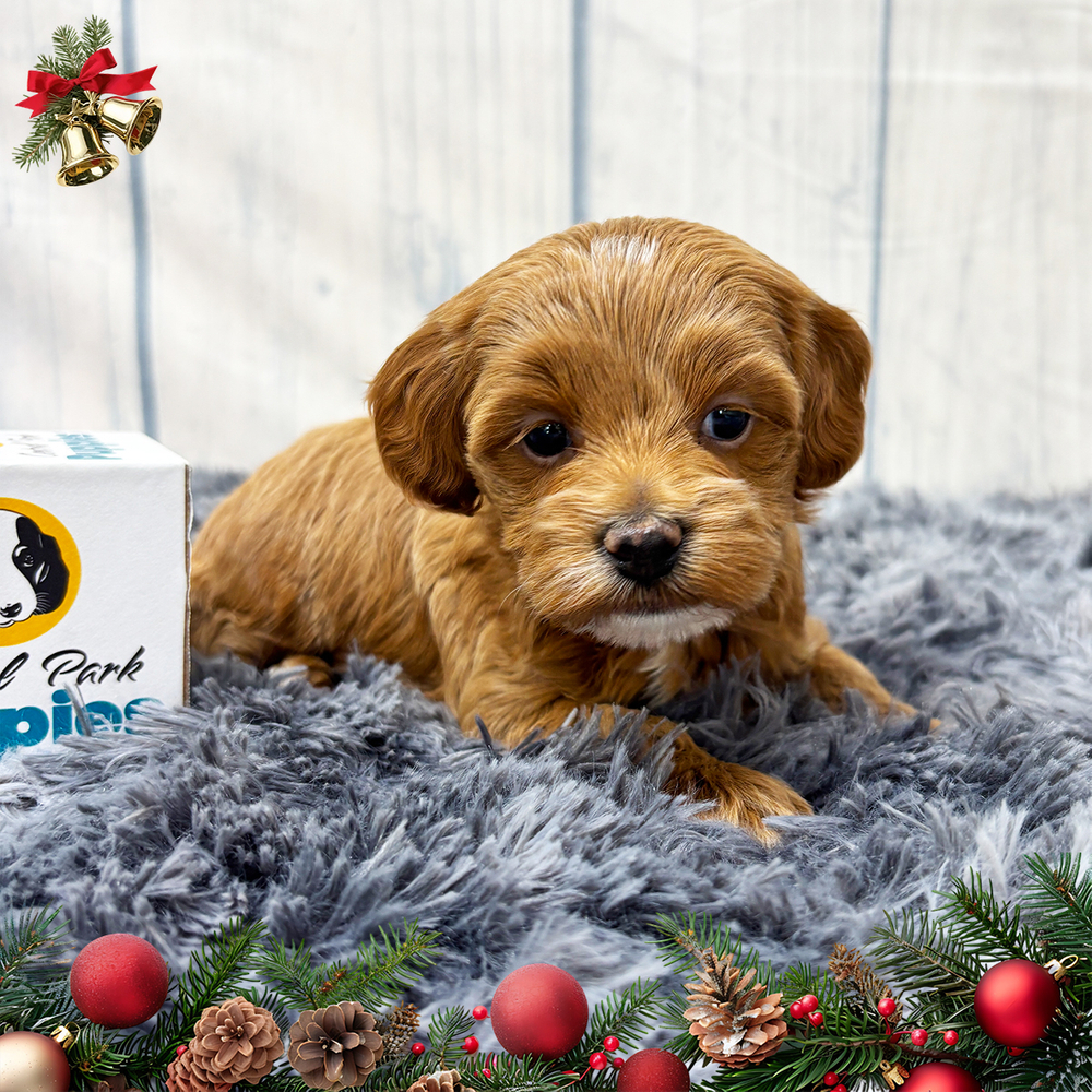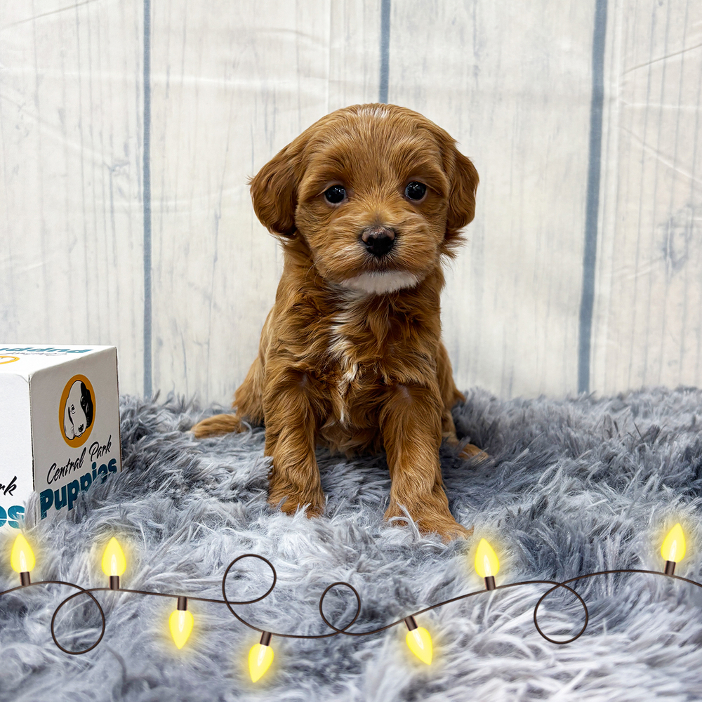 Adorable F1B Maltipoo puppy with a striking red and white coat. This sweet pup, Amara, boasts a striking red fur and loves bringing joy to any family. Being a Scorpio, Amara is naturally curious and quite loyal. Central Park Puppies will safely deliver Amara directly to your home, anywhere in the US. Ready to bring Amara into your loving home? She's waiting to cuddle and play with you.