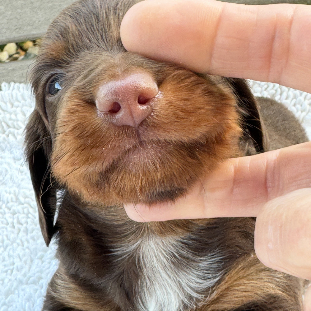 Chocolate & tan Mini Dachshund Brewer is the perfect playful companion. Brewer's playful nature and warm personality make him a delightful companion, always eager for fun and cuddles. As a Virgo, Brewer is thoughtful and has a strong sense of loyalty. Central Park Puppies will safely deliver Brewer directly to your home, anywhere in the US. Ready to bring Brewer into your loving home? Act now to secure this delightful puppy today.