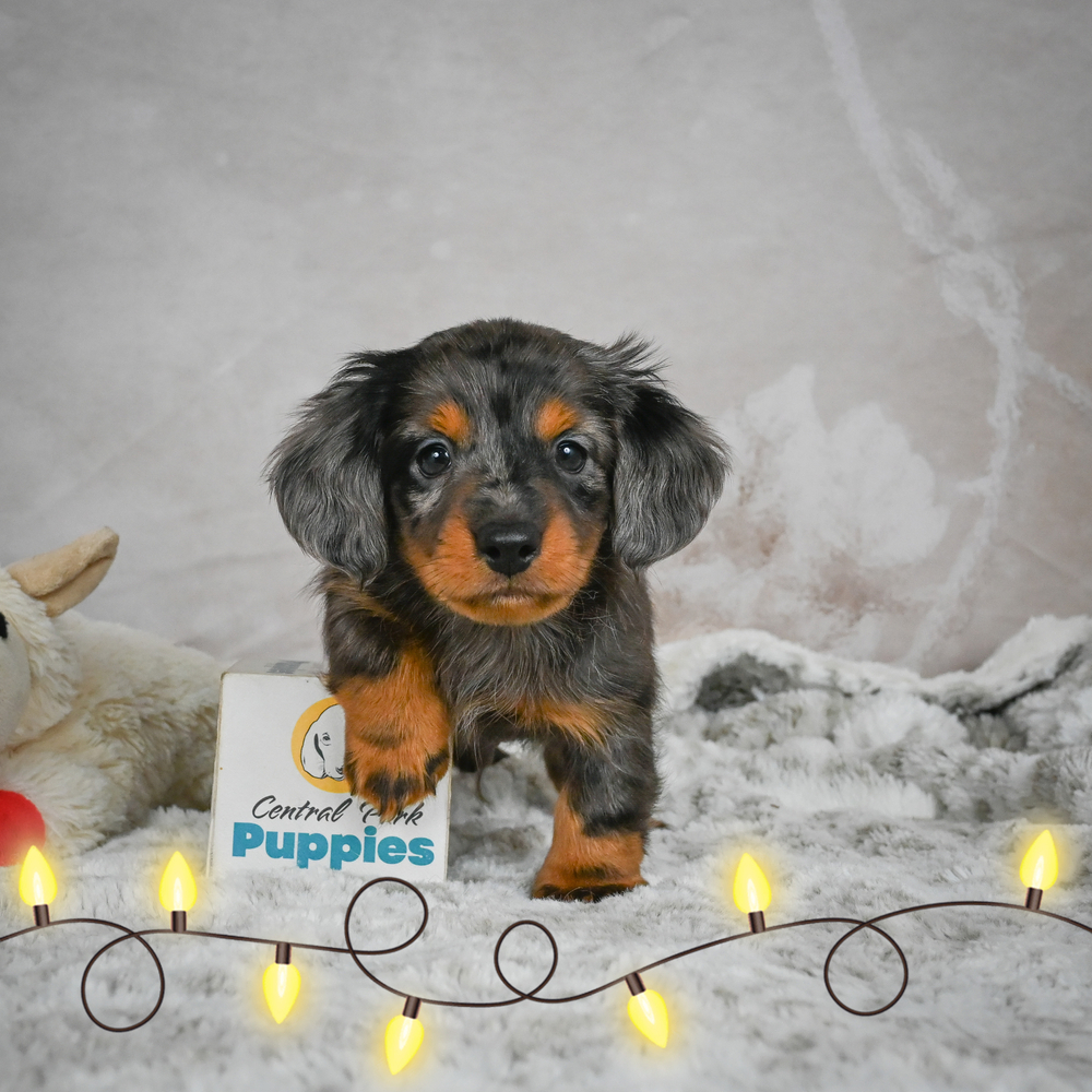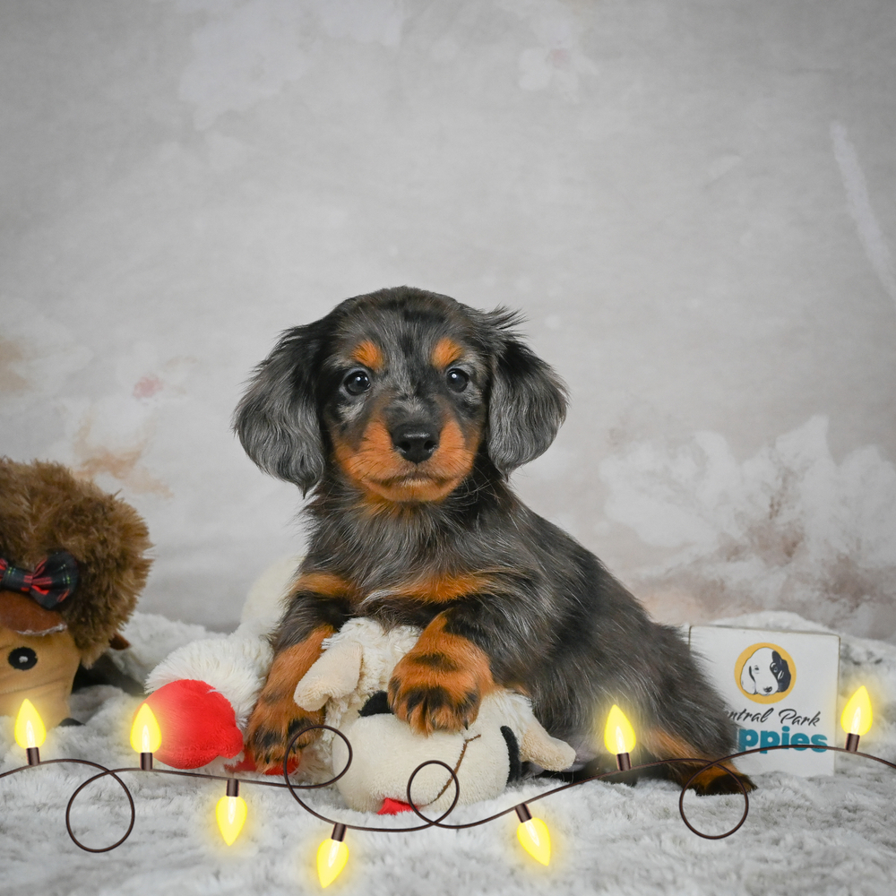 Charming Mini Dachshund puppy with unique long-haired, silver dapple coat is in search of a home. Adorable and lively, Silver loves playing and cuddling, making him a wonderful companion for daily antics. Born under Libra, Silver has an innate charm and a sociable nature that draws everyone in. Central Park Puppies will safely deliver the puppy directly to your home, anywhere in the US. Ready to bring Silver into your loving home? He's eager to become your family's new best friend.