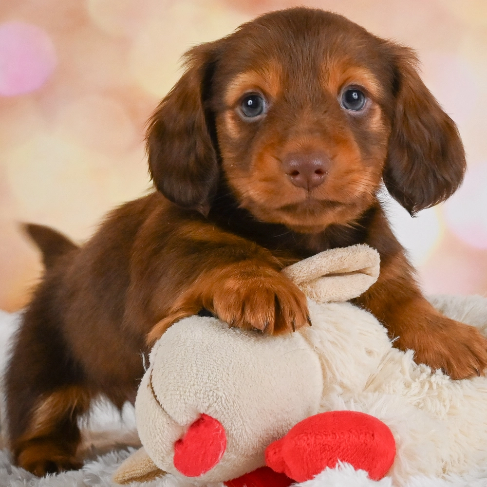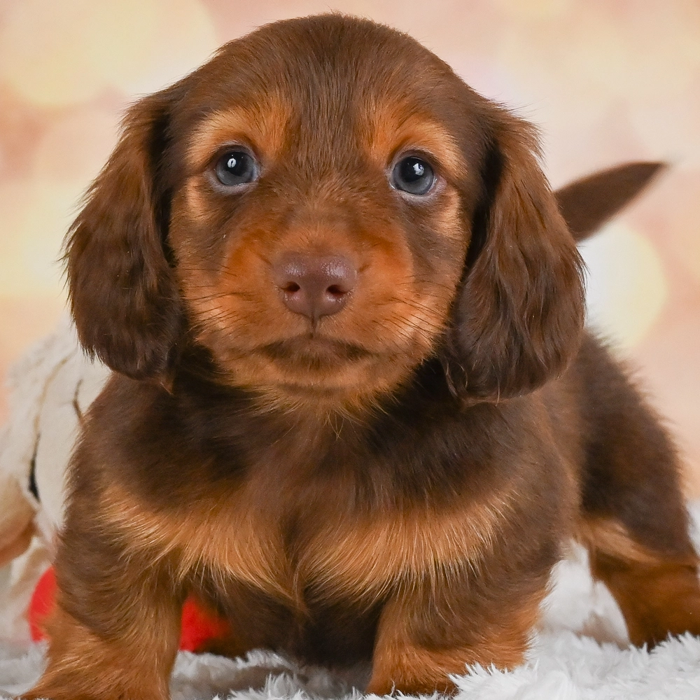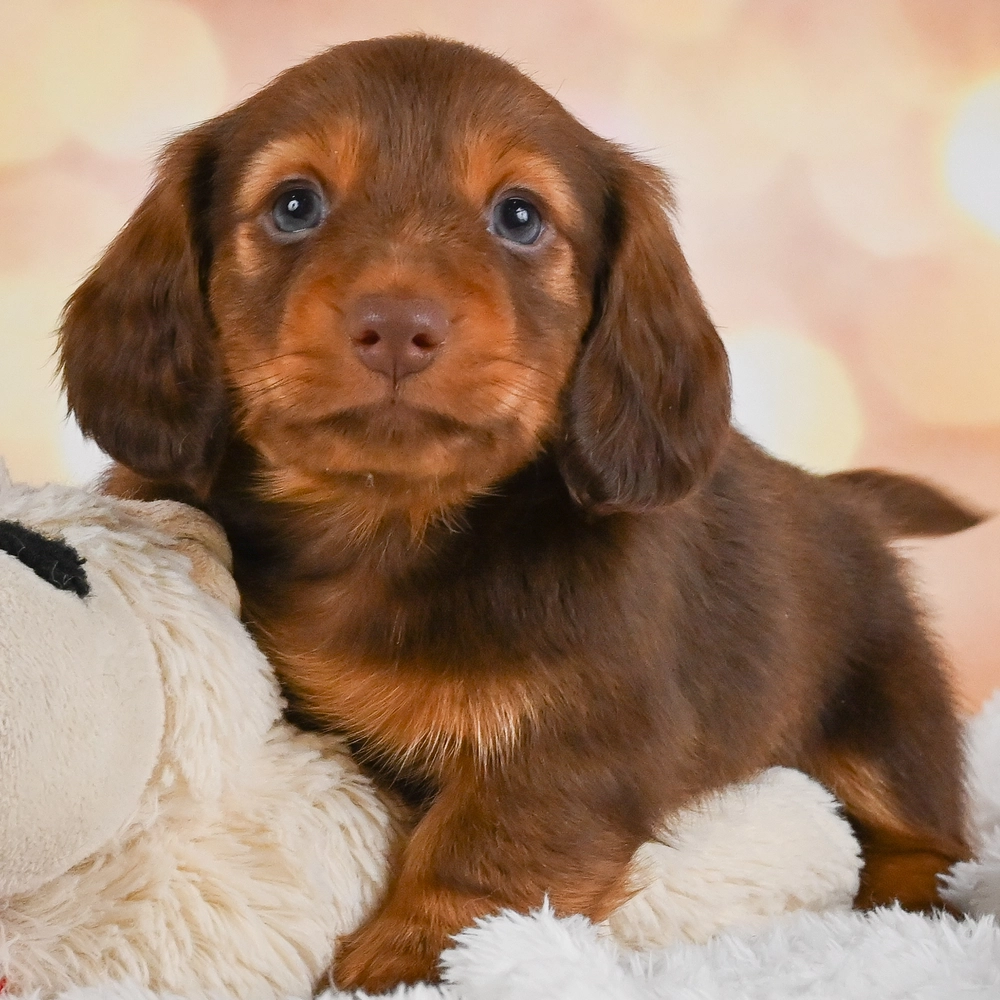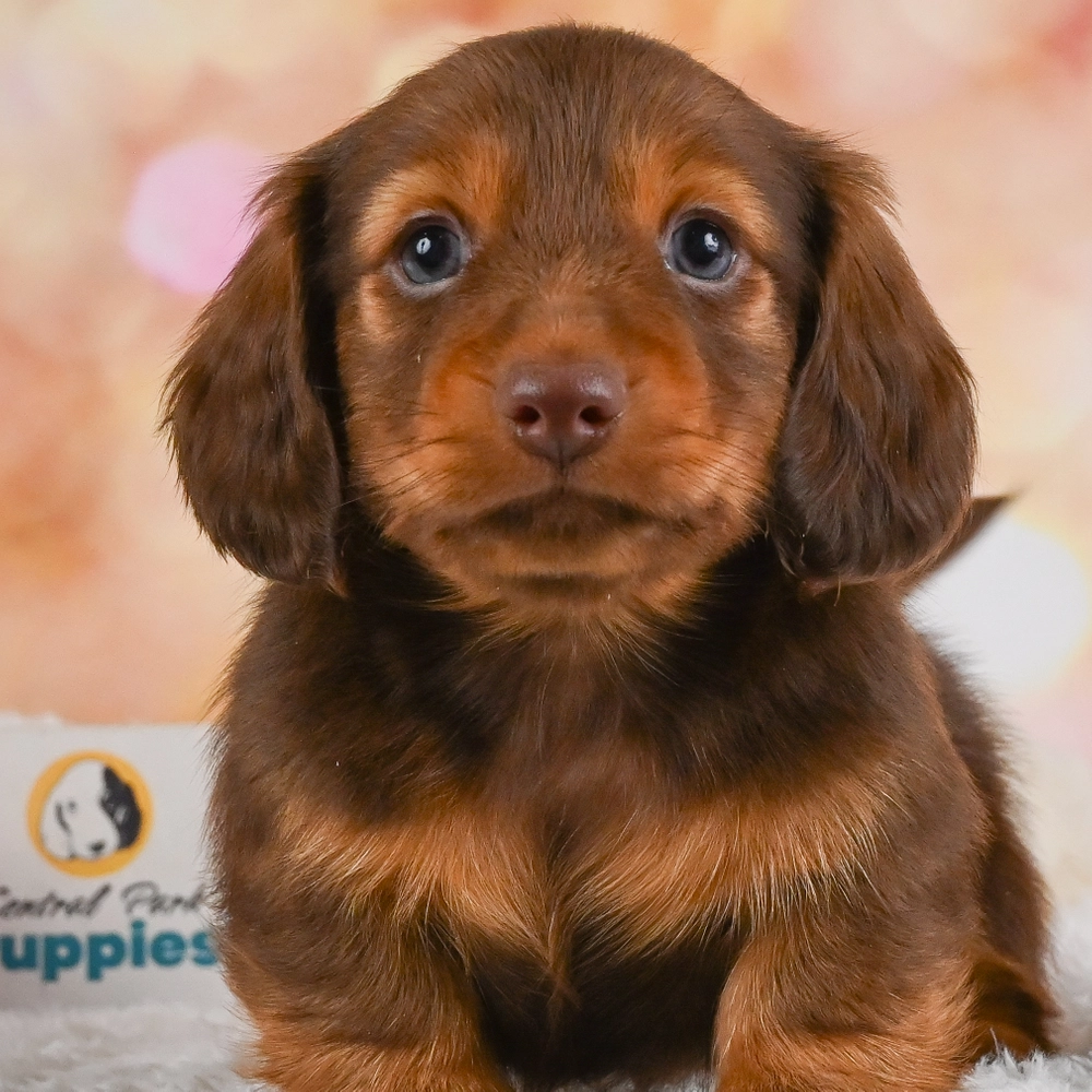 Charming chocolate and tan Mini Dachshund with a spirited character. Buster, with his sprightly nature, will capture your heart. His friendly demeanor and striking colors are irresistible. As an Aquarius, Buster is highly intelligent and loves exploring new things. Central Park Puppies will safely deliver the puppy directly to your home, anywhere in the US. Ready to bring Buster into your loving home? Embrace the joy and warmth he will surely bring!